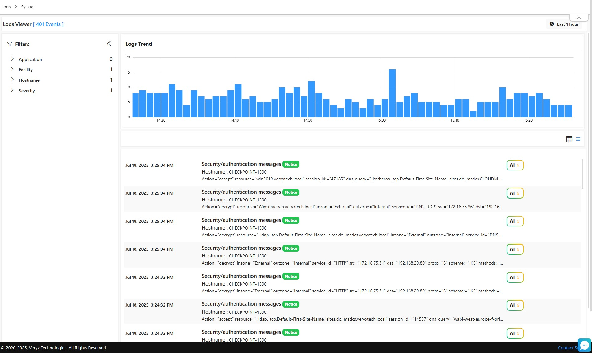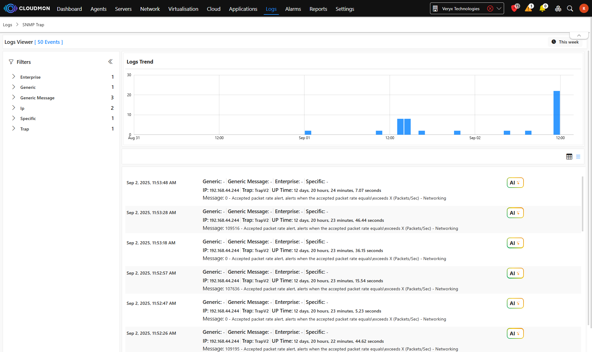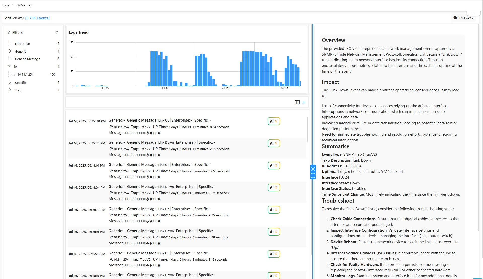 Cloudmon provides an Assistive AI feature that intelligently analyzes logs received from SNMP Traps, Syslog, and Windows Event Logs. This feature uses AI capabilities to interpret and decode the logs, allowing users to quickly understand the nature of the event and take appropriate actions.